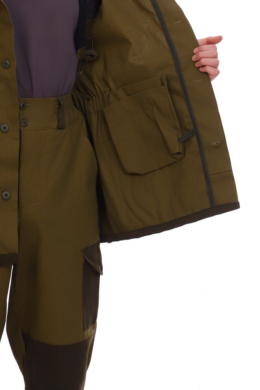➠ Куртка прямого кроя, с супатной бортовой застежкой на пуговицы и капюшоном пристегивающимся на пуговицы. На полочках наклонные прорезные карманы с клапаном застегиваются на пуговицы. По линии талии расположена кулиса собранные на эластичную ленту. Рукава с налокотниками, над которыми расположены накладные карманы с клапанами фиксирующиеся на контактную ленту, с манжетами. Карман на внутренней подкладке левой полочки.