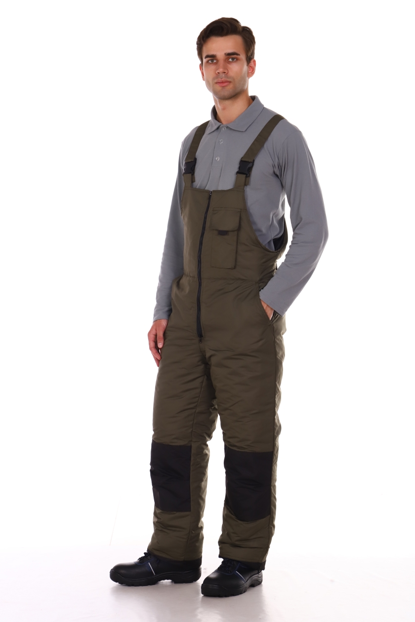 ➠ Полукомбинезон с центральной застежкой на двухзамковую тесьму «молния», с внутренней ветрозащитной планкой, с притачными по линии талии полочками и спинкой. На левой полочке накладной карман с клапаном.. Спинка стянута по линии талии эластичной тесьмой.. Передние половинки с карманами с отрезным бочком, с наколенниками. Внизу боковых швов обработаны разрезы, застегивающиеся на тесьму «молния». По низу полукомбинезона пуфты.
